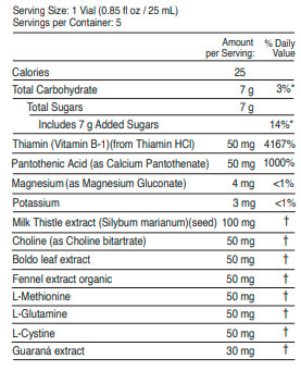 A recovery detox formula containing L-Glutamine Silymarin extract and Boldo extract. Available in a box of 5 drinkable vials of 25 mL each.