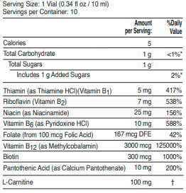B-Complex exclusive formulation with 3,000 mcg of the important Vitamin B-12 as Methylcobalamin and L-Carnitine. Available in a box of 10 drinkable vials of 10 ml each.