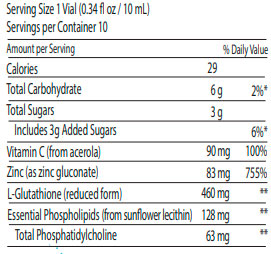 LIPOSOMAL GLUTATHIONE, essential phospholipids, zinc and vitamin C derived from the acerola fruit.