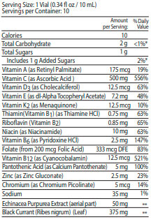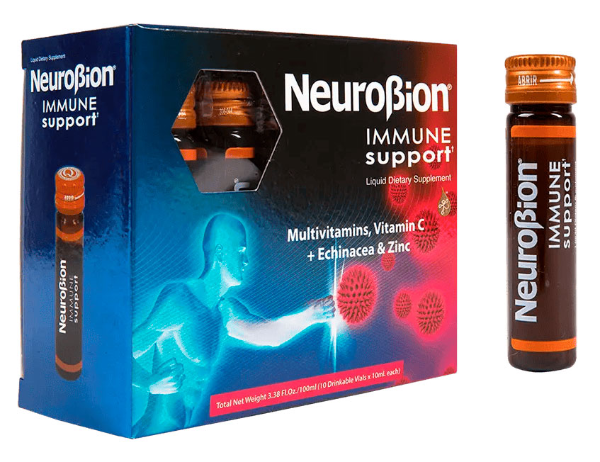 Una fórmula exclusiva que contiene: vitaminas del complejo-B, Vitamina C, Equinacea y Zinc. Disponible en líquido, caja de 10 viales de 10ml c/u.