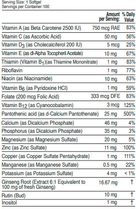 Vitamin E, C + Zinc Folic Acid, Minerals & Ginseng. Available in blister of 120 softgels and bottles of 30 and 100 softgels.